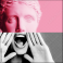 >Naklejka na meble>Contemporary collage of plaster statue head in pop art style tinted pink and emotional fashion young woman screaming like in megaphone holding hands near her face with open mouth.