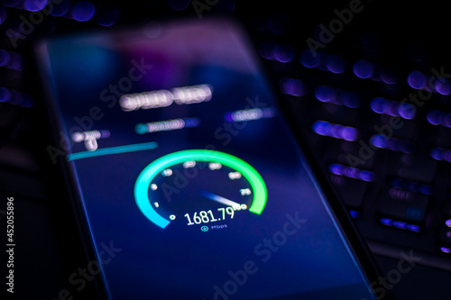 Fototapeta - Speedtest on phone. 5G network test. Very fast internet. Testing speed of the internet connection.