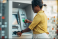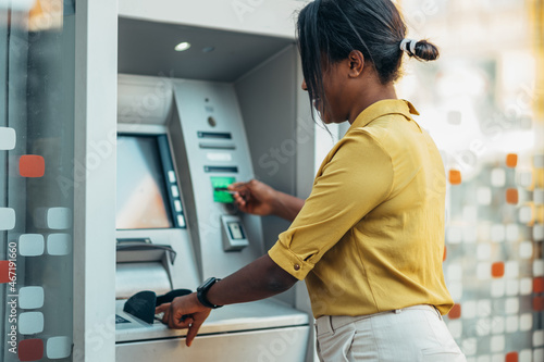 Fototapeta - African american woman using an atm machine and a credit card