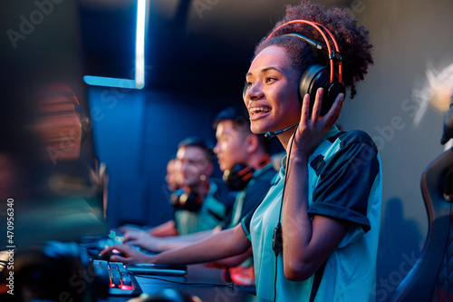 Happy African female gamer wearing headphones looking at PC screen and smile during esports tournament in gaming club