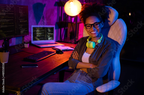 Photo of skilled lady freelancer sit desk folded arms modern web development in workspace workstation late evening shifts