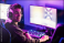 A happy gamer in gaming room playing video games and smiling at the camera.