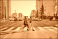 urban cyclist rides through the empty streets of the city at sunrise, with the golden light