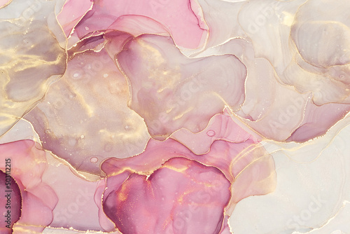 Abstract liquid ink painting background in pink colors with golden splashes.