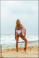 Fototapeta - Kobieta z deską surfingową, surferka na tle oceanu na plaży.
