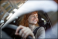 Fototapeta - Beautiful young woman driving her new car at sunset. Woman in car. Close up portrait of pleasant looking female with glad positive expression, woman in casual wear driving a car