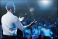 Motivational speaker with headset performing on stage