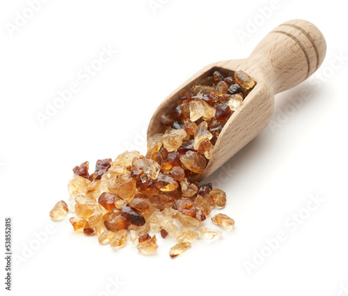 Cukier brązowy kandyzowany w drewnianej łopatce na białym tle
