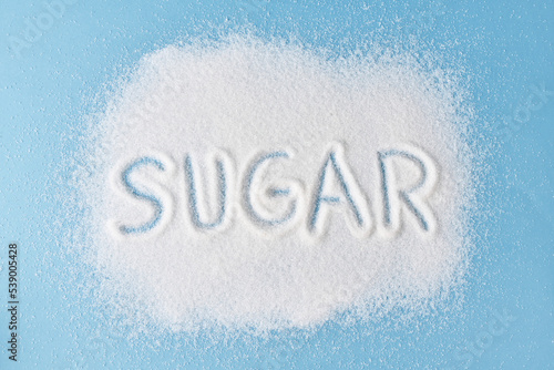 Rozsypany cukier na niebieskim tle z napisem SUGAR