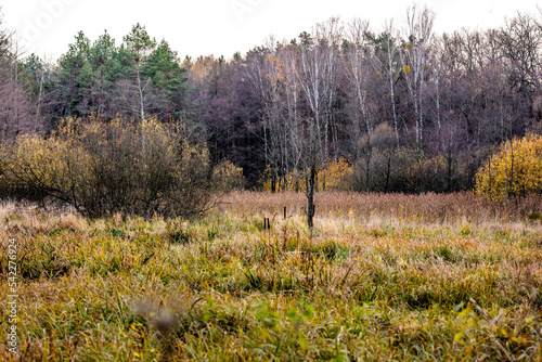 Bagienny krajobraz dzikiej puszczy, jesień, las