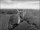 The vast expanse features towering wind turbines amidst vibrant green fields, with a breathtaking sky brightening the horizon during dusk