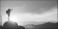 >Naklejka na meble>vision for success ideas. businessman's perspective for future planning. Silhouette of man holding binoculars on mountain peak against bright sunlight sky background.
