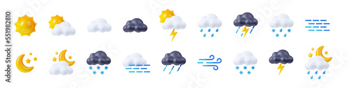 Fototapeta - 3d render weather icons set, sun shining, clouds, lightnings and snow or rain forecast elements for web design. Cartoon illustration in plastic minimal style, isolated objects on white background