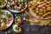 Fototapeta - Przekąski na przyjęcie sylwestrowe i karnawał: kabanosy we francuskim cieście, paluszki z ciasta francuskiego i pesto, szaszłyki serowo-warzywne, kanapki i sos pomidorowy