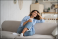 >Naklejka na meble>Young happy relaxed Latin woman enjoying quiet moments at home with cup of tea or coffee, smiling female holding mug with hot drink resting on sofa in living room and dreaming, relaxing of everything