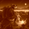 Soldier with an assault rifle and tactical gear, sitting near a campfire in a forest, very dark night, Generative AI