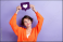 >Naklejka na meble>Photo of lovely pretty lady wear stylish clothes arm hold social media like under head look empty space isolated on purple color background