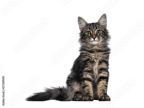 Fototapeta - Cute young black tabby blotched Norwegian Forestcat kitten, sitting facing front. Looking with green brown eyes towards camera. Isolated cutout on transparent background.