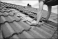 Fototapeta - man at uncovered roof, replaces broken roof shingles with new ones. roof maintenance