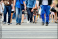 Fototapeta - Motion blurred pedestrians crossing sunlit street
