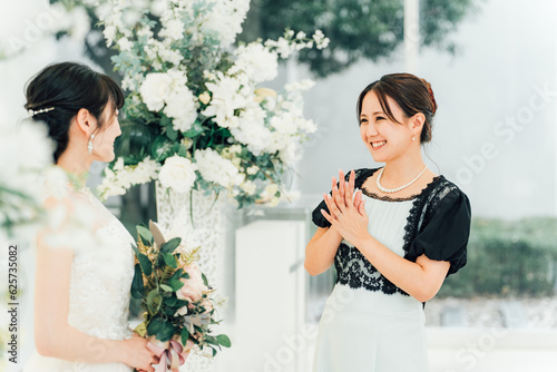Fototapeta - 結婚式の披露宴で話す新婦とゲスト・友人・親族の女性