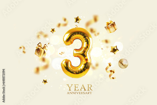 >Naklejka na meble>Gold festive balloons 3 year anniversary with golden confetti, presents, mirror ball and stars fly on a beige background with bokeh lights and sparks. Birthday luxury three card, a creative idea