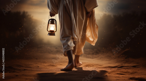 Fototapeta - lantern illuminating way someone walking wearing sandals. Concept for Psalm 119:105 "Your word is a lamp unto my feet, and a light unto my path."