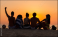 Fototapeta - Silhouettes a young people sitting on a beach looking at sunset