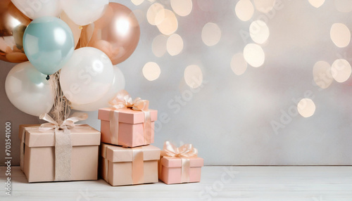 Tło z prezentami i balonami w delikatnych pastelowych odcieniach różu