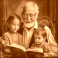 Happy grandfather, two granddaughters read book together. Smiling girls, senior man laughing, enjoying family time. Family love, leisure, bonding. Child care, home comfort, fun, happiness, peaceful