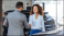 >Naklejka na meble>Happy salesman congratulating his female customer for buying a new car in a showroom. Woman buying a new car in car dealership. Handshake and good deal