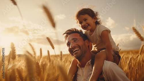 >Naklejka na meble>happy cheerful father with child walking by cereal field at sunset, man with daughter or son playing at summer, kid sitting on father shoulder