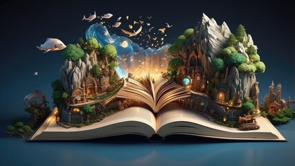 magic book. book with fantasy story about pirates, ship and adventures in his bedroom. transparent pirate ship flying out of a book with fairytale. fantasy story, reading. kids literature