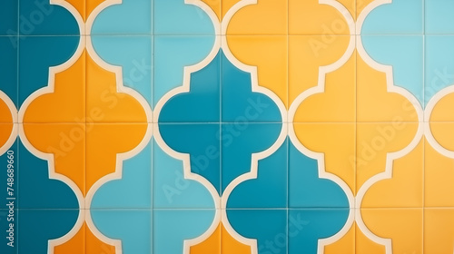 Fototapeta - Marokańskie wzory, tło z płytek kafelków bogato zdobionych. Wystrój łazienki, kuchni, podłoga żółta i morska