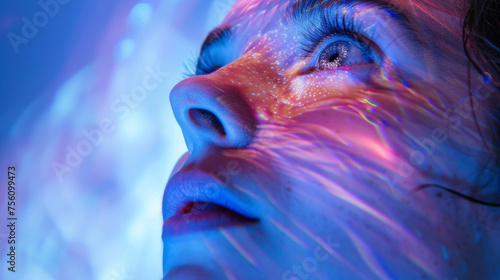 Fototapeta - A closeup of a persons face lit up by the colorful lighting effects from a projection mapped installation as they look up in awe and wonder.