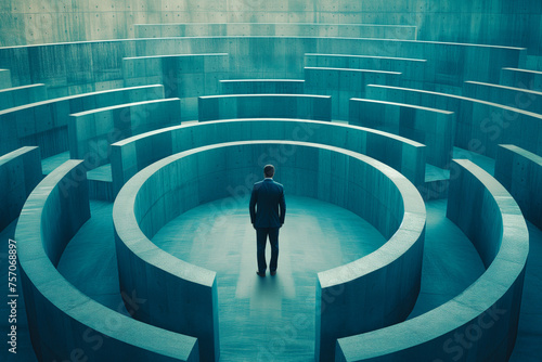 Conceptual image of a businessman standing the complexd labyrinth, finding solution to exit