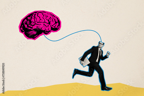 Creative photo collage young running businessman guy professional smart worker carry laptop huge brain geek caricature drawing background