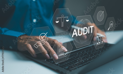 Fototapeta - business audit concept. Professional conducting a business audit using laptop with virtual interface displaying audit, and compliance data analysis icons. Evaluation financial, standard certification,
