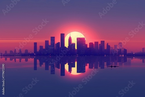 >Naklejka na meble>The sun slowly descends, casting a warm golden light over the towering buildings and bustling streets of a sprawling metropolis, A simplistic representation of a city skyline at dusk, AI Generated