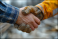 Two construction workers shake hands at a construction site, symbolizing teamwork and agreement with safety gloves on
