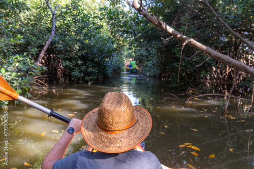 Fototapeta - Spływ kajakowy po namożynach rzeki Gambia w Gambii, kobieta w kajaku
