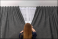 Fototapeta - Młoda dziewczyna zaslania ciężkie szare zasłony w oknie w hotelowym pokoju