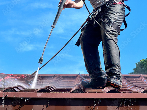 Fototapeta - Mycie dachu przy użyciu myjki ciśnieniowej.