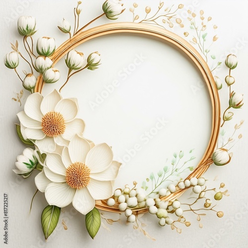 Fototapeta - Okrągła ramka otoczona gałązkami bawełny, kwiatami, roślinami i trawami. Naturalne, ekologiczne tło z miejscem na tekst