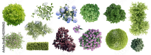 Fototapeta - Different types of garden plants isolated on transparent background. Top view. 3D render.
