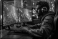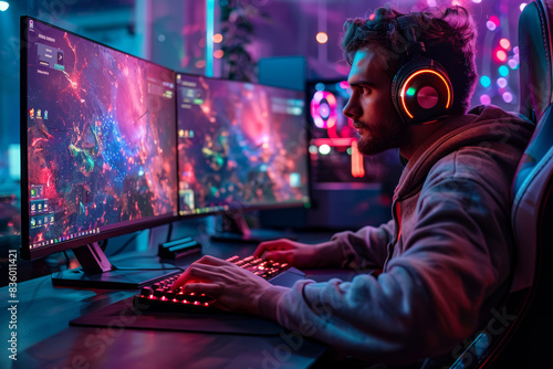 Fototapeta - Male gamer fully immersed in a vibrant digital realm, illuminated by the glow of RGB lighting, sits in front of a dual-monitor setup, captivated by the action on screen