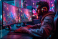 >Naklejka na meble>Male gamer fully immersed in a vibrant digital realm, illuminated by the glow of RGB lighting, sits in front of a dual-monitor setup, captivated by the action on screen