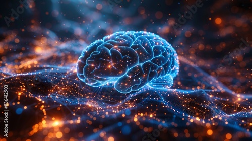 Abstract blue polygonal brain hologram on blurry background. AI and machine learning concept. 3D rendering.
