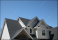 Gable with tan shingle and shake siding, double hung windows with white frame, on a dutch roof attic at an American single family home neighborhood USA