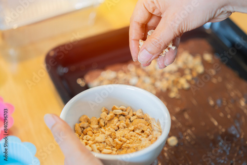 Fototapeta - Female hand baker decorating tasty cake with cashew nuts at table. Homemade sweet concept.